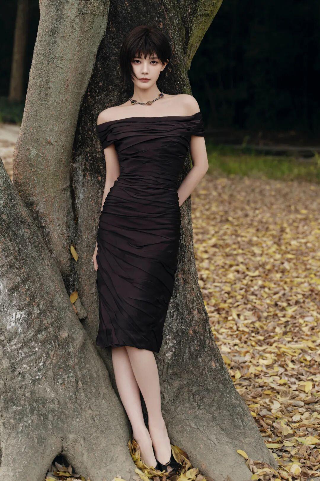 那件黑色露肩连衣裙的设计很绝,不对称的肩带和抹胸褶皱把她的直角肩和纤细锁骨衬得更明显了,皮肤在黑色面料衬托下白得发光。