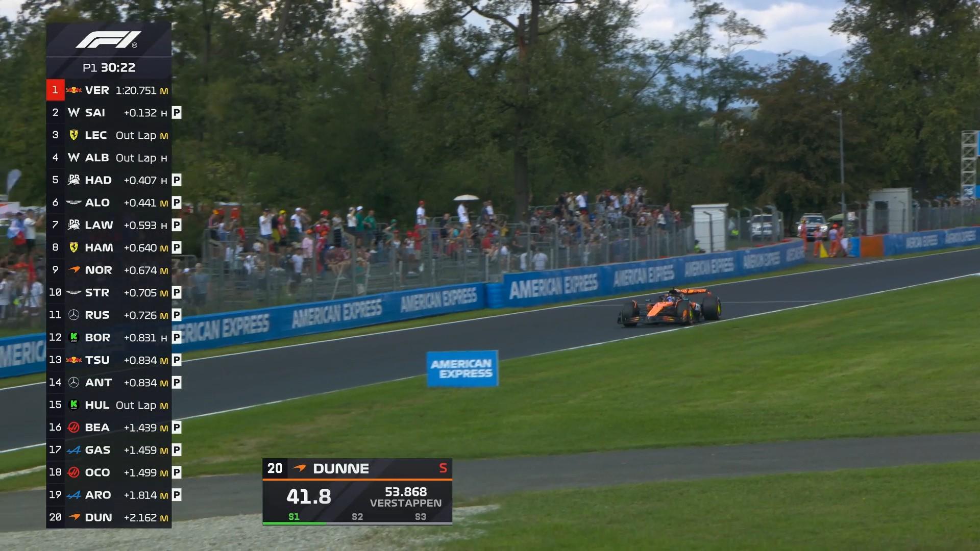 一练时间过半,维斯塔潘的中性胎成绩暂时领跑,塞恩斯落后0.1秒紧随其后;
